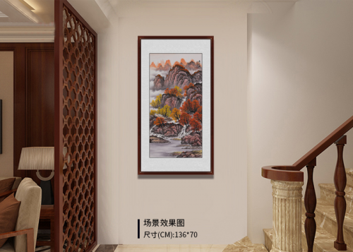 2、别墅楼梯两侧的装饰最好是各类国画,不论是《旭日东升》、《源远流长》这样的寓意美好的吉祥类画作,还是《溪山积翠》、《万山红遍》等景色优美的山水类挂画,都是合适的选择。挂画指南如下: