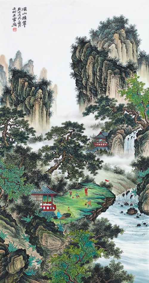 此幅青绿山水画《溪山积翠》,用笔墨描绘绿色葱茏的大自然美景,面上山势高耸绵延,山峦险峻,飞瀑流泉,山谷间云雾缭绕,俊逸的树木点缀其间,古雅的房舍在绿树掩映下若隐若现,溪流从亭台前逶迤而去,山水相依,意境显现。作品构图严谨,造型丰满,笔法俊雅,气韵生动,画面感较强,体现了画家扎实的艺术功底和高深的山水境界。观赏这样的画作,让人心生幽静,在闹市中守候心灵的家园,值得拥有。