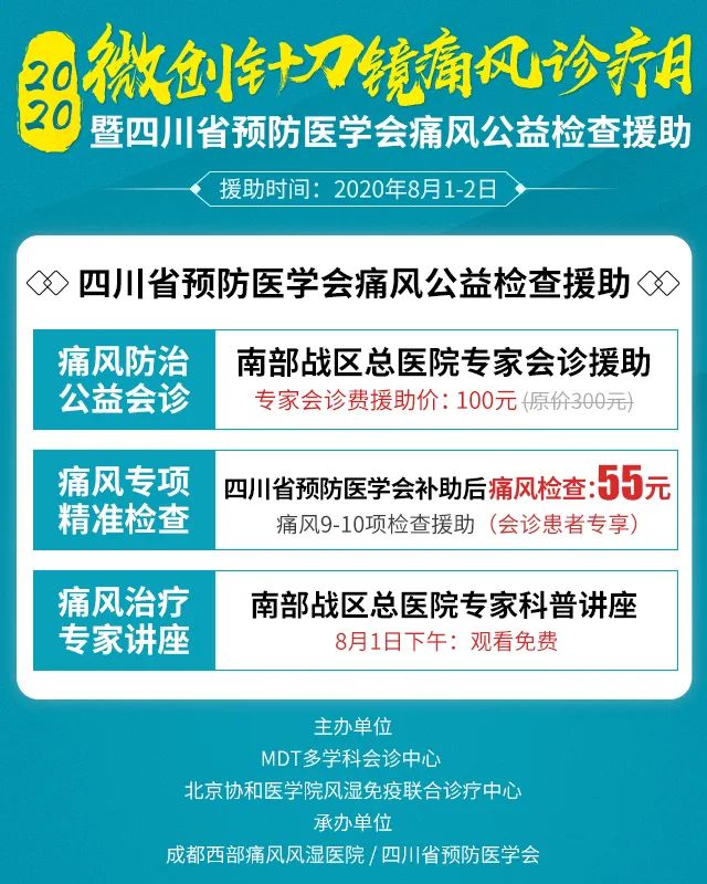 除了专家团会诊活动,我们还联系到四川省预防医学会给与公益援助支持,为本次会诊患者提供会诊与检查方面的补助,以促进痛风、类风湿患者积极治疗、控制好疾病。