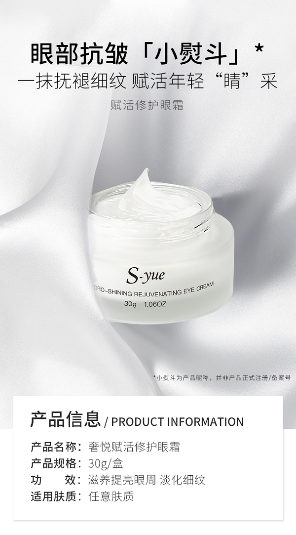当下社会,许多人白天忙于工作和学习,夜晚熬夜加班、追剧、玩游戏,一时熬夜没什么,但长此以往,眼肌状态便不佳,众所周知,眼周肌肤是人体最早开始出现衰老症状的部位,当我们肆意挥霍年轻时,你的眼部可能已经渐渐出现干纹、鱼尾纹,甚至是法令纹,时时刻刻暴露出正逐渐衰老的痕迹!这正是眼霜发挥效用的绝佳时期!有奢悦水光赋活眼霜在手,淡潜眼纹焕亮双眼年轻神采,从此不惧熬夜带来眼部衰老问题。