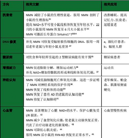 NMN功效诸多,除了抗衰老和延长寿命以外, NMN还具有预防神经退行性疾病(如老年痴呆);提高胰岛素的敏感性,改善2级糖尿病;增加造血干细胞的活性和线粒体的功能;维持端粒的长度,可用以治疗纤维化疾病 ;增加骨密度 ,增强耐力,改善运动协调能力;提高眼睛功能;解酒护肝等诸多功效。