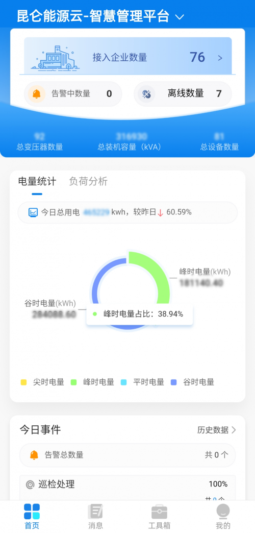 智慧电力管理平台依托泛能网-电力运维产品,通过标准物联接入西南油气田公司的148个电力系统,实时监控用电数据,结合多种人工智能优化算法与专家模型,助力成都中石油昆仑能源发现电力设施及生产运行管理过程在安全、可靠、经济、高效等方面存在的问题、风险和提升空间,并通过线上线下运维服务和策略建议等方式,实现安全生产高效化及电力设施资产管理的数字化。