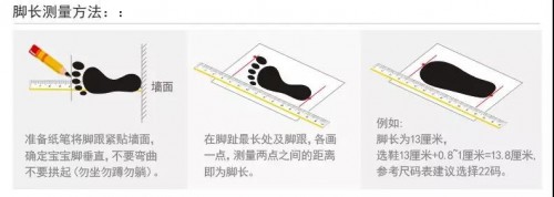 具体测量方法为:首先把一张A4纸铺置于地上,双脚除去袜子,让孩子自然站立,一只脚放在A4纸上;然后用笔垂直紧贴着脚将脚的轮廓画下来,注意后脚跟要垂直;最后用尺子量出脚的最长以及最宽的距离,即最大脚趾跟脚后跟突出的垂直的直线跑离为脚长,测量完宝宝的脚长之后就可以按照鞋码对照表进行选择购买。