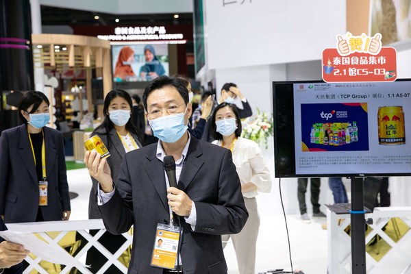 天丝集团驻中国特别代表在2020进博会泰国食品集市上向中方企业代表介绍产品