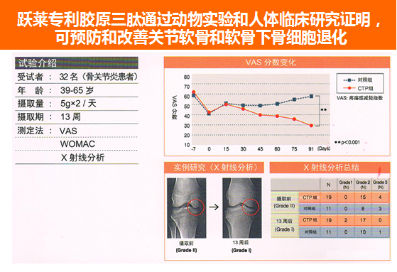 目前市面上的胶原蛋白产品主要有3种,第一代胶原蛋白分子量在3000-5000D,第二代胶原蛋白肽(前面提到健骨产品的主要配料)分子量在1000-3000D,跃莱专利的第三代胶原三肽分子量在280D,而只有三肽形式的胶原蛋白,才能被小肠直接吸收。并且胶原三肽不是像氨基酸那样依靠小肠内不同氨基酸的浓度差进行吸收的,而是小肠内有一个多肽物质的吸收通道,是直接被吸收利用的!吸收后的胶原三肽会直接作用于骨骼,CTP可提高耐力作用,促进钙的吸收,有显著增强老龄骨强度,增强骨骼中羟脯氨酸和骨钙含量,以及增强细胞免疫的作用等多种功效,立体维护骨骼健康。