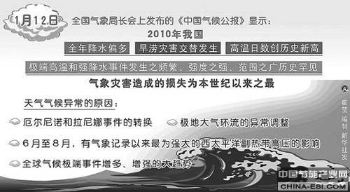 《2010年中国气候公报》指出,去年我国极端高温和强降水事件发生之频繁、强度之强、范围之广历史罕见。2010年,年平均气温较常年偏高0.7℃,是1961年以来第十个最暖年,也是第十四个连续气温偏高年。2010年,我国极端天气气候事件频发,气象灾害造成的损失为本世纪以来之最。